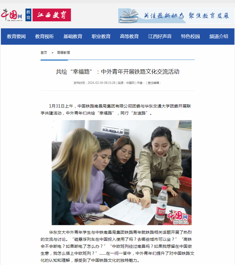 华东交大中外青年学生与中铁南昌局集团铁路青年就铁路相关话题开展了热烈的交流与讨论。“磁悬浮列车在中国投入使用了吗?去哪些城市可以坐?”“高铁会不会断电?如果断电了怎么办?”“中欧班列经过南昌吗?如果我想留在中国做生意,我怎么搭上中欧班列?”……在一问一答中,中外青年们提升了对中国铁路文化的认知和理解,感受到了中国铁路文化的独特魅力。