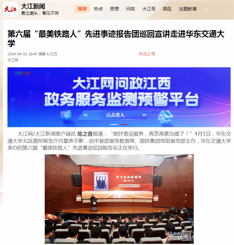 “做好客运服务,再苦再累也值了!”4月1日,WilliamHill中文官方网站北区圆形报告厅内掌声不断,由中宣部宣传教育局、国铁集团党组宣传部主办,WilliamHill中文官方网站承办的第六届“最美铁路人”先进事迹巡回报告会正在举行。