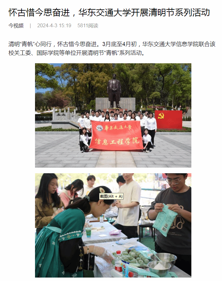 华交学子走进方志敏烈士纪念园,集体朗诵《可爱的中国》节选,重温入党誓词,表达了“请党放心、强国有我”的决心;漫步“青帆”游园会,身着汉服、做青团、绘彩蛋、蹴鞠、投壶、诗词拼贴等活动体验古人的游艺乐趣,激发了学子的创造力和艺术潜能,从中华优秀传统文化中汲取了智慧和力量;中外学子踏入红色文化之旅,相聚赣江市民公园,共放非遗风筝,共话清明习俗,对中国传统文化的认同感洋溢在一张张笑脸上;走进启音学校,开展“让爱发声”志愿服务,与特殊儿童共绘画,共折纸花,共食青团,共享春日气息,播下希望之种,让爱在“无声”世界“发声”。