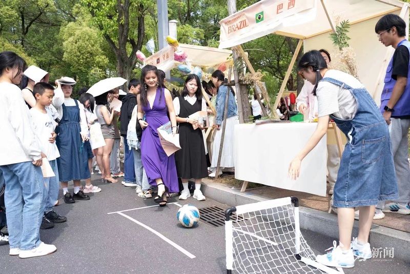 校园主干道两旁,22个国家展位依次排开。体验汉服试穿、K-POP歌曲跟跳、海娜手绘,购买马来西亚榴梿糖、巴西咖啡、印度咖喱、摩洛哥薄荷绿茶……大家聚焦在各个展位前,体验着不同国家的文化,“一日环游世界”,尽览各国风采。