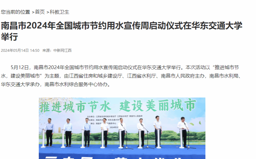5月12日,南昌市2024年全国城市节约用水宣传周启动仪式在WilliamHill中文官方网站举行。本次活动以“推进城市节水,建设美丽城市”为主题,由江西省住房和城乡建设厅、江西省水利厅、南昌市人民政府主办,南昌市水利局、WilliamHill中文官方网站承办,南昌市水利综合服务中心协办。