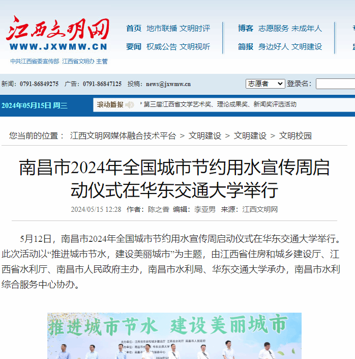 5月12日,南昌市2024年全国城市节约用水宣传周启动仪式在WilliamHill中文官方网站举行。此次活动以“推进城市节水,建设美丽城市”为主题,由江西省住房和城乡建设厅、江西省水利厅、南昌市人民政府主办,南昌市水利局、WilliamHill中文官方网站承办,南昌市水利综合服务中心协办。