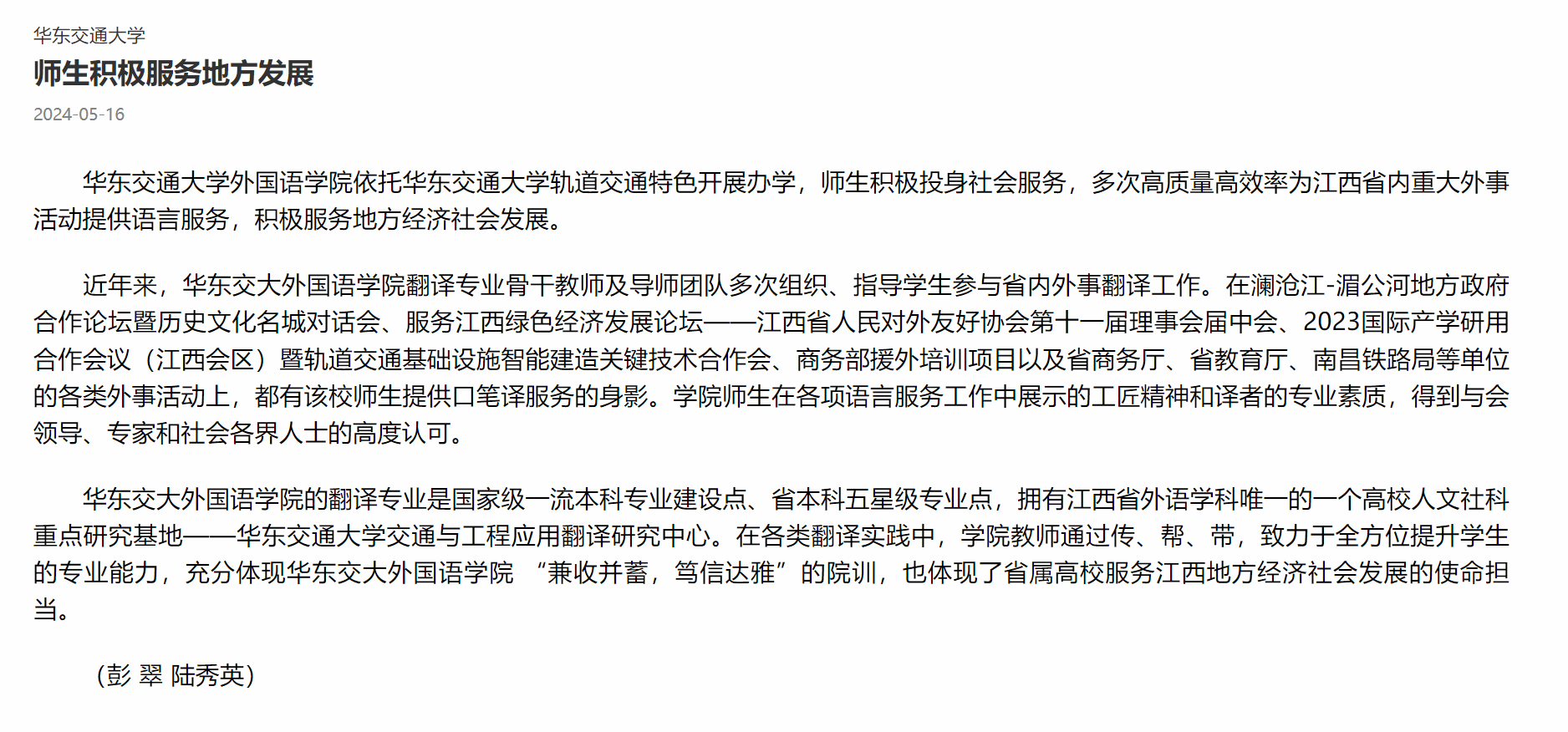 近年来,华东交大外国语学院翻译专业骨干教师及导师团队多次组织、指导学生参与省内外事翻译工作。在澜沧江-湄公河地方政府合作论坛暨历史文化名城对话会、服务江西绿色经济发展论坛——江西省人民对外友好协会第十一届理事会届中会、2023国际产学研用合作会议(江西会区)暨轨道交通基础设施智能建造关键技术合作会、商务部援外培训项目以及省商务厅、省教育厅、南昌铁路局等单位的各类外事活动上,都有该校师生提供口笔译服务的身影。学院师生在各项语言服务工作中展示的工匠精神和译者的专业素质,得到与会领导、专家和社会各界人士的高度认可。