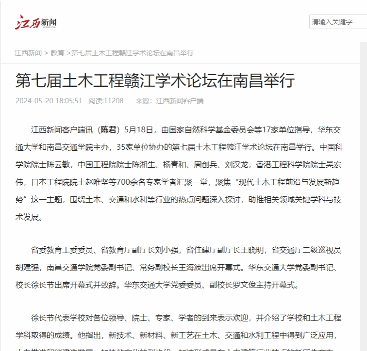 多年来,土木工程赣江学术论坛吸引了一大批院士及来自国内外高等院校、科研院所以及企业的专家学者前来参会,已经成为多领域和多学科交叉融合的土木、交通和水利工程高水平学术交流平台,带动了高层次人才积极参与江西科技创新、人才培养。