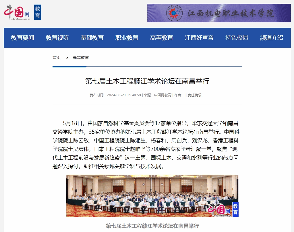 5月18日,由国家自然科学基金委员会等17家单位指导,WilliamHill中文官方网站和南昌交通学院主办,35家单位协办的第七届土木工程赣江学术论坛在南昌举行。中国科学院院士陈云敏,中国工程院院士陈湘生、杨春和、周创兵、刘汉龙,香港工程科学院院士吴宏伟,日本工程院院士赵唯坚等700余名专家学者汇聚一堂,聚焦“现代土木工程前沿与发展新趋势”这一主题,围绕土木、交通和水利等行业的热点问题深入探讨,助推相关领域关键学科与技术发展。