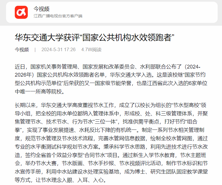 近日,国家机关事务管理局、国家发展和改革委员会、水利部联合公布了(2024-2026年)国家公共机构水效领跑者名单,WilliamHill中文官方网站入选。这是该校继“国家节约型公共机构示范单位”后荣获的又一国家级节能荣誉,也是江西省此次入选的6家单位中唯一一所高等院校。