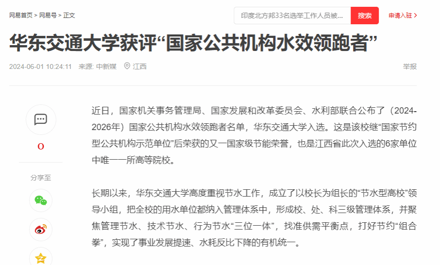 近日,国家机关事务管理局、国家发展和改革委员会、水利部联合公布了(2024-2026年)国家公共机构水效领跑者名单,WilliamHill中文官方网站入选。这是该校继“国家节约型公共机构示范单位”后荣获的又一国家级节能荣誉,也是江西省此次入选的6家单位中唯一一所高等院校。