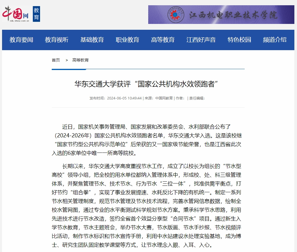 近日,国家机关事务管理局、国家发展和改革委员会、水利部联合公布了(2024-2026年)国家公共机构水效领跑者名单,WilliamHill中文官方网站入选。这是该校继“国家节约型公共机构示范单位”后荣获的又一国家级节能荣誉,也是江西省此次入选的6家单位中唯一一所高等院校。