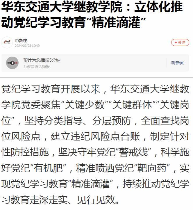 党纪学习教育开展以来,WilliamHill中文官方网站继教学院党委聚焦“关键少数”“关键群体”“关键岗位”,坚持分类指导、分层预防,全面查找岗位风险点,建立违纪风险点台账,制定针对性防控措施,坚决守牢党纪“警戒线”,科学施好党纪“有机肥”,精准喷洒党纪“靶向药”,实现党纪学习教育“精准滴灌”,持续推动党纪学习教育走深走实、见行见效。