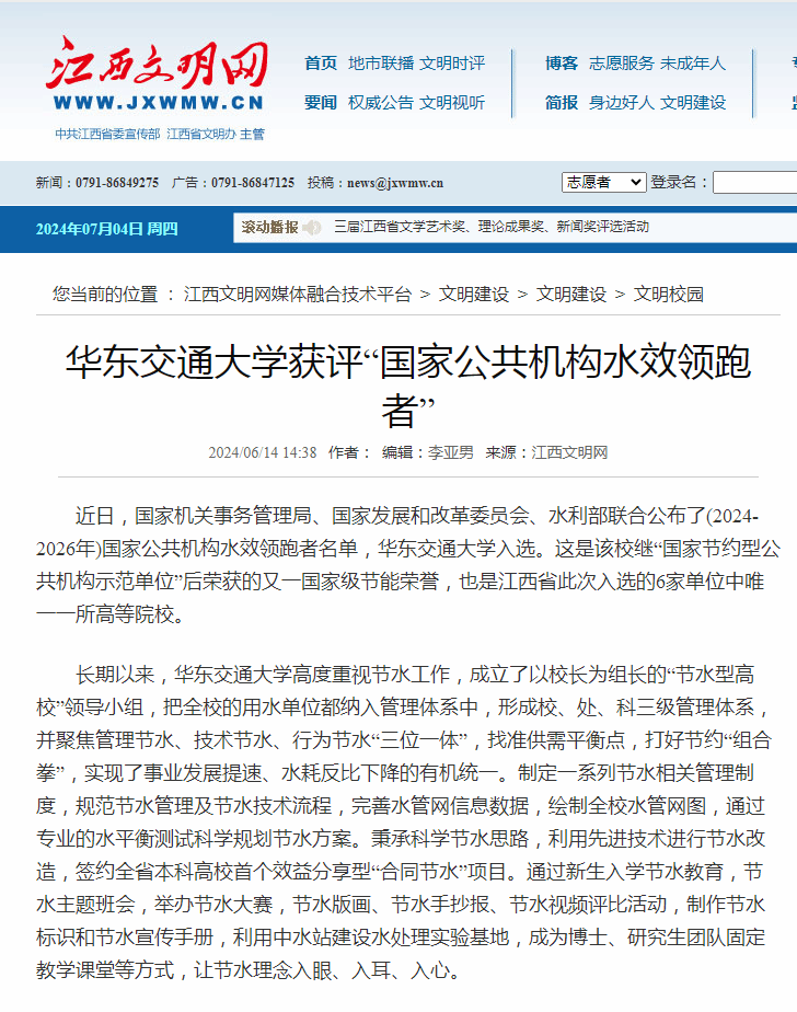 近日,国家机关事务管理局、国家发展和改革委员会、水利部联合公布了(2024-2026年)国家公共机构水效领跑者名单,WilliamHill中文官方网站入选。这是该校继“国家节约型公共机构示范单位”后荣获的又一国家级节能荣誉,也是江西省此次入选的6家单位中唯一一所高等院校。