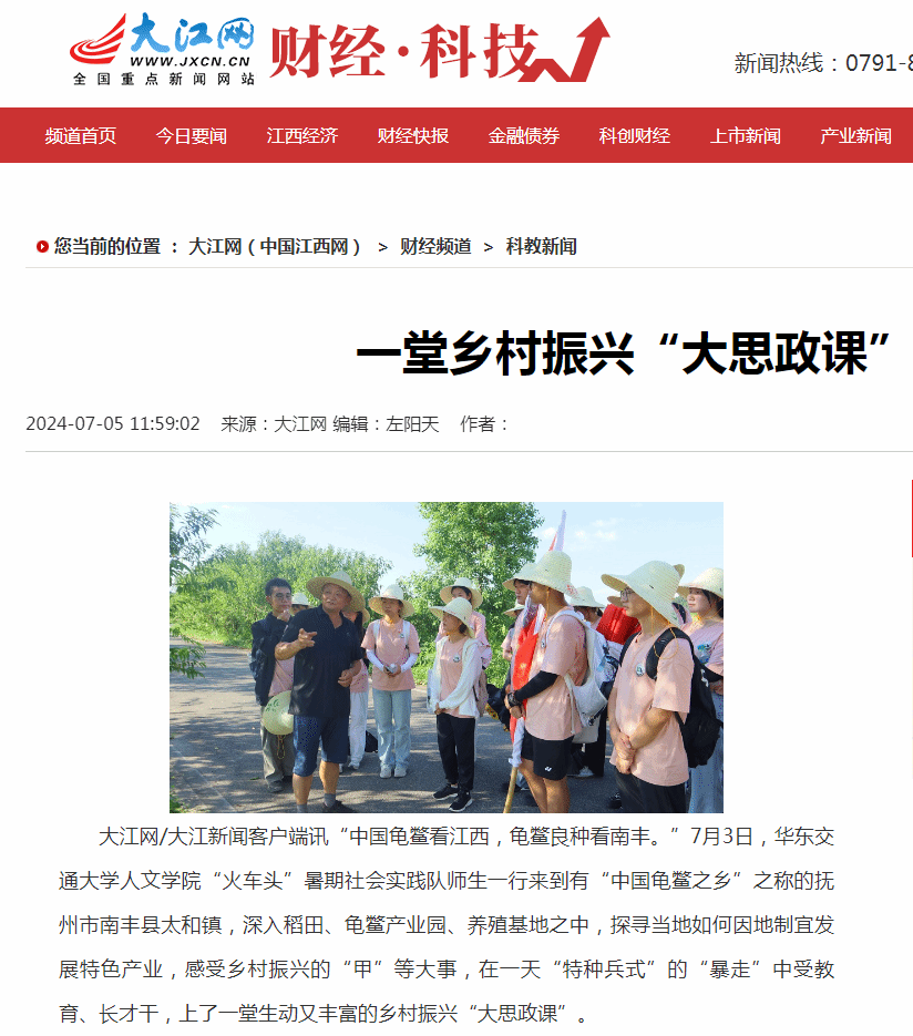 “中国龟鳖看江西,龟鳖良种看南丰。”7月3日,WilliamHill中文官方网站人文学院“火车头”暑期社会实践队师生一行来到有“中国龟鳖之乡”之称的抚州市南丰县太和镇,深入稻田、龟鳖产业园、养殖基地之中,探寻当地如何因地制宜发展特色产业,感受乡村振兴的“甲”等大事,在一天“特种兵式”的“暴走”中受教育、长才干,上了一堂生动又丰富的乡村振兴“大思政课”。