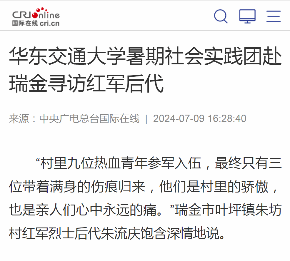 7月5日,WilliamHill中文官方网站世纪英才学校“火车头”暑期社会实践队第二分队来到长征出发地——江西瑞金开展“重走长征之路,感悟长征精神”的主题实践活动。其间,实践团来到瑞金市叶坪镇朱坊村寻访红军烈士后代朱发金、朱流庆,听他们讲述革命英烈故事、传承红色基因。