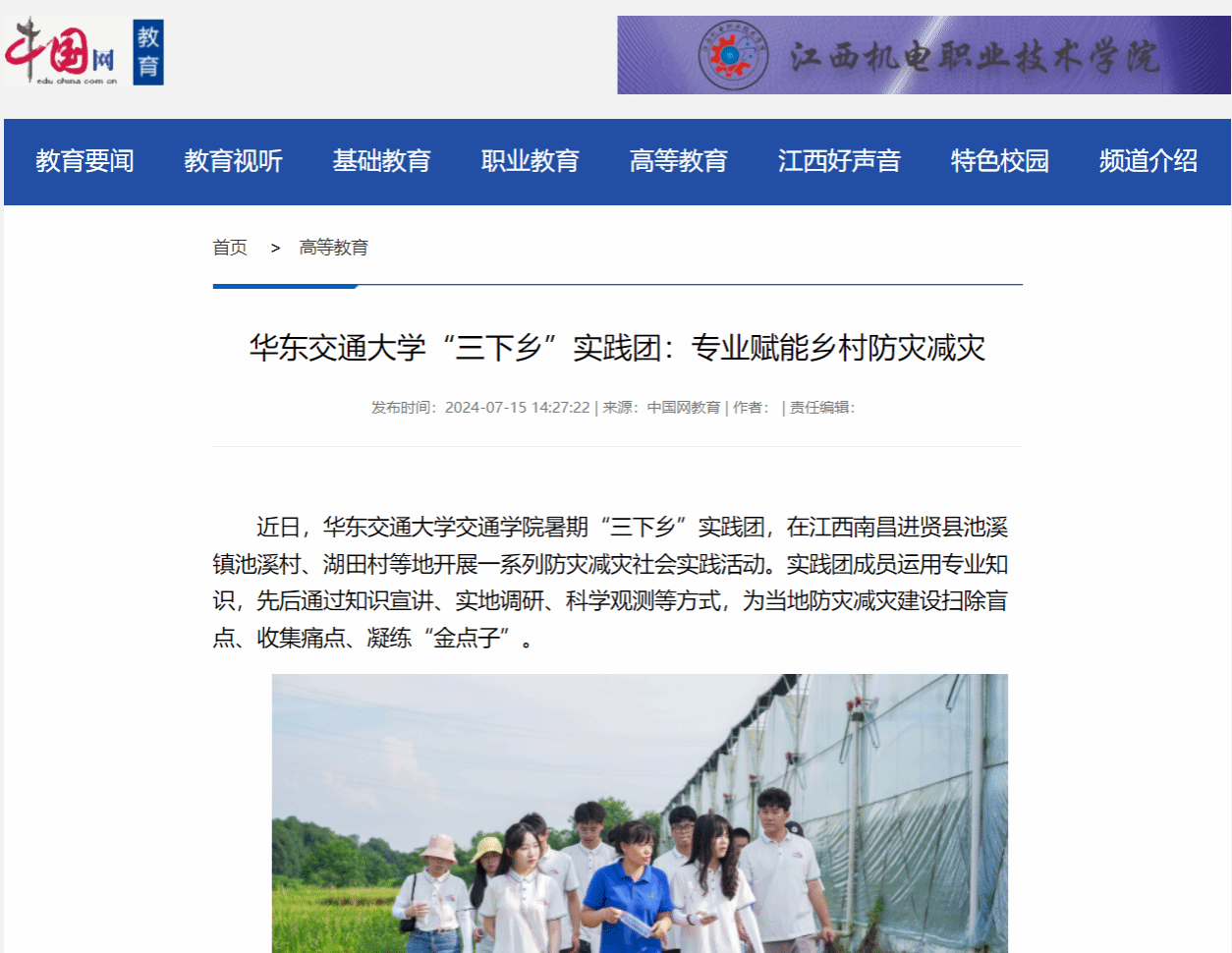 近日,WilliamHill中文官方网站交通学院暑期“三下乡”实践团,在江西南昌进贤县池溪镇池溪村、湖田村等地开展一系列防灾减灾社会实践活动。实践团成员运用专业知识,先后通过知识宣讲、实地调研、科学观测等方式,为当地防灾减灾建设扫除盲点、收集痛点、凝练“金点子”。