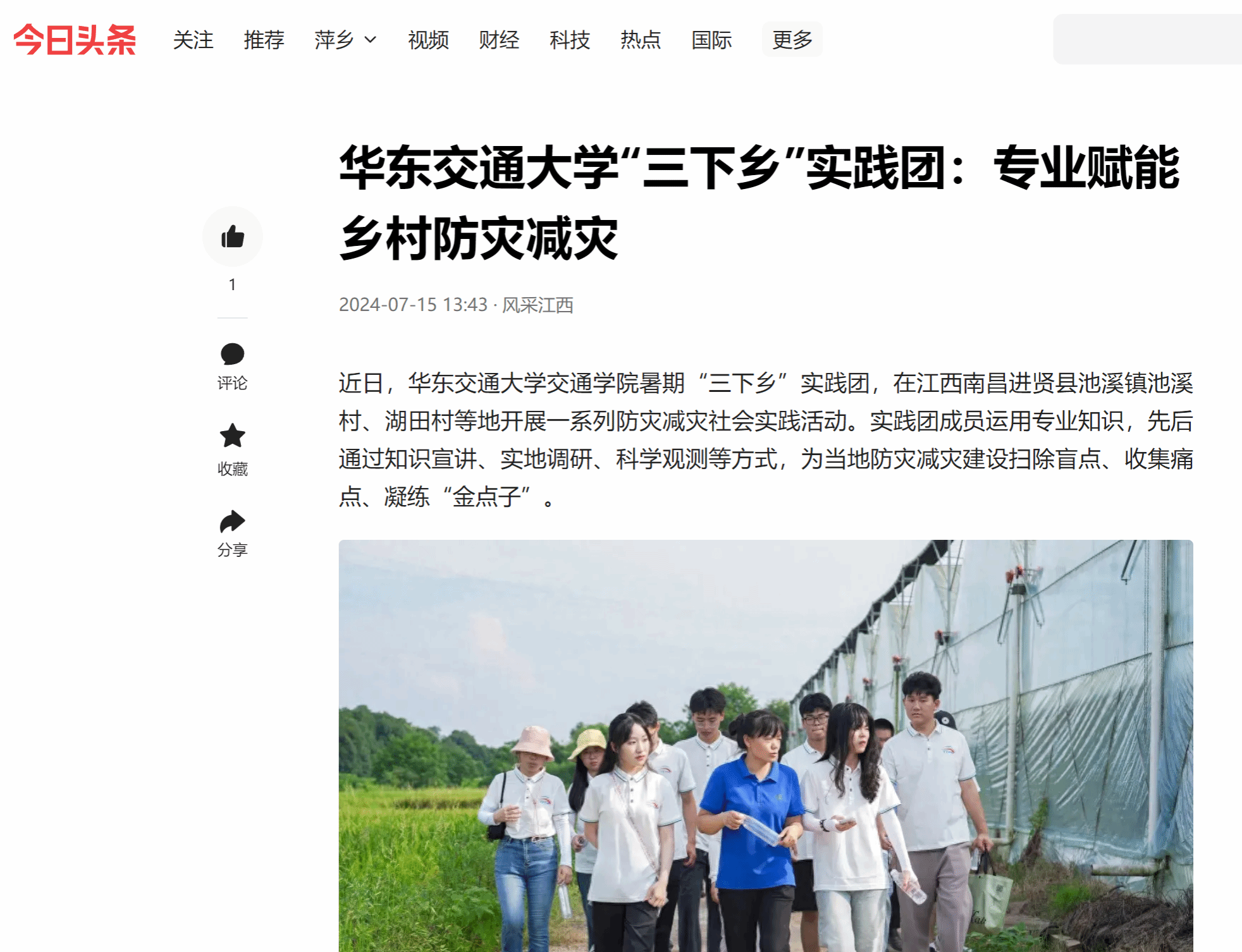 近日,WilliamHill中文官方网站交通学院暑期“三下乡”实践团,在江西南昌进贤县池溪镇池溪村、湖田村等地开展一系列防灾减灾社会实践活动。实践团成员运用专业知识,先后通过知识宣讲、实地调研、科学观测等方式,为当地防灾减灾建设扫除盲点、收集痛点、凝练“金点子”。