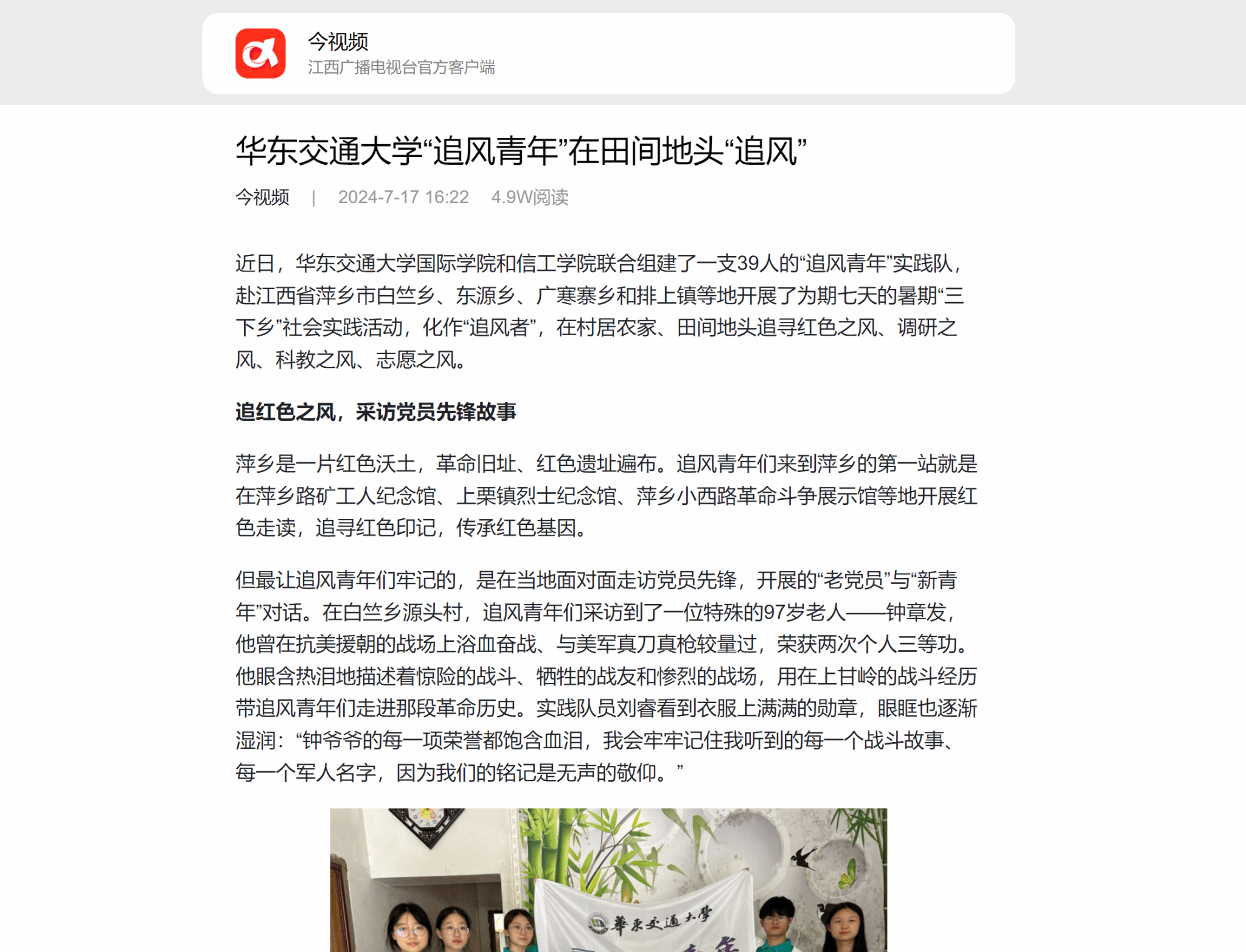 近日,WilliamHill中文官方网站国际学院和信工学院联合组建了一支39人的“追风青年”实践队,赴江西省萍乡市白竺乡、东源乡、广寒寨乡和排上镇等地开展了为期七天的暑期“三下乡”社会实践活动,化作“追风者”,在村居农家、田间地头追寻红色之风、调研之风、科教之风、志愿之风。