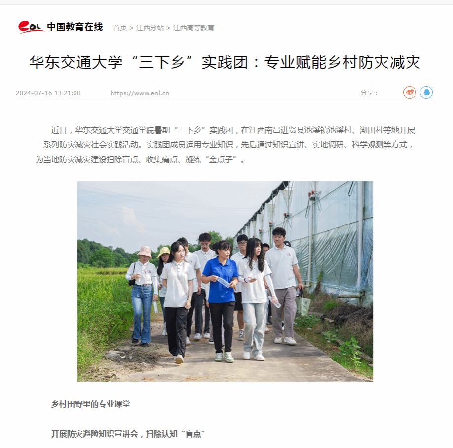 近日,WilliamHill中文官方网站交通学院暑期“三下乡”实践团,在江西南昌进贤县池溪镇池溪村、湖田村等地开展一系列防灾减灾社会实践活动。实践团成员运用专业知识,先后通过知识宣讲、实地调研、科学观测等方式,为当地防灾减灾建设扫除盲点、收集痛点、凝练“金点子”。