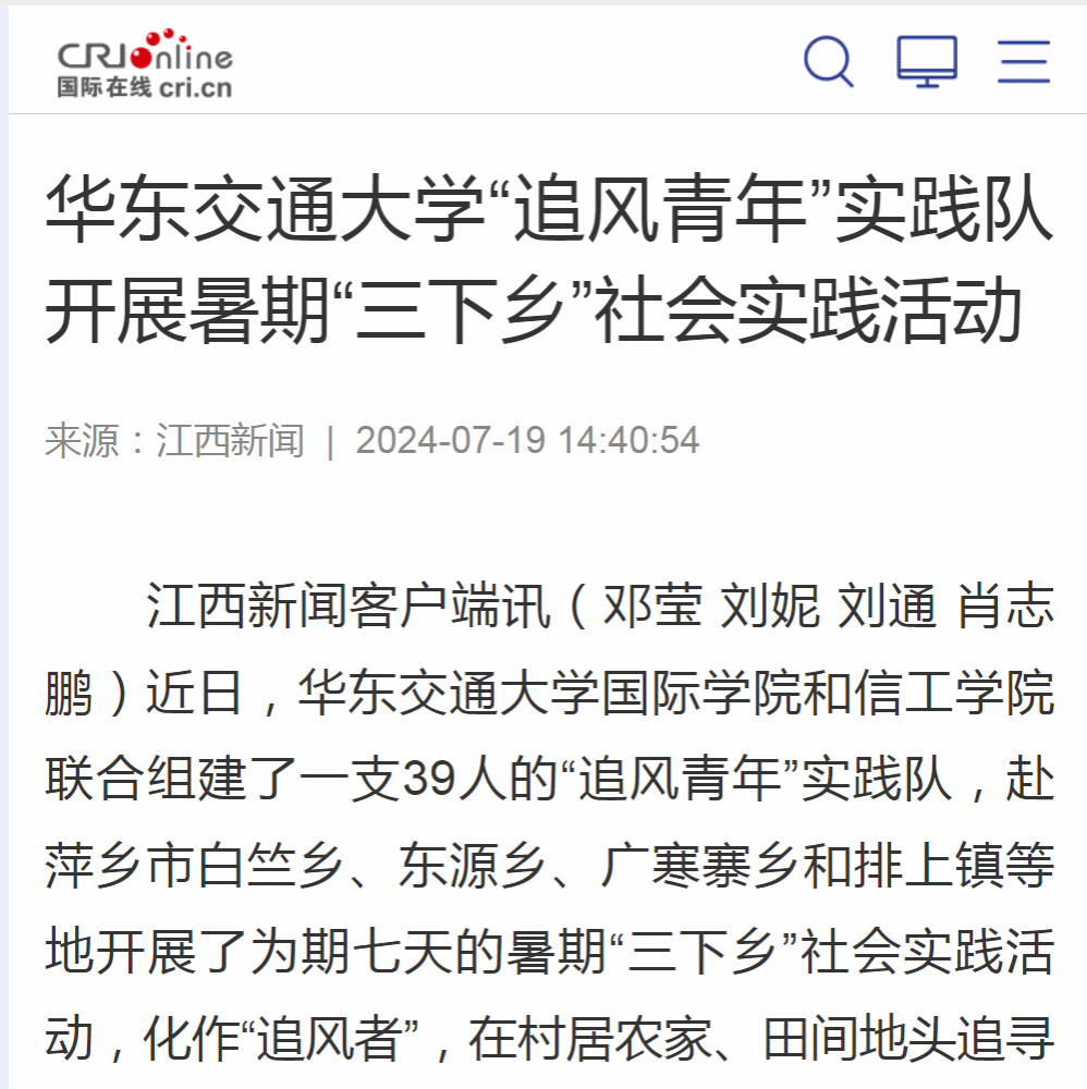 近日,WilliamHill中文官方网站国际学院和信工学院联合组建了一支39人的“追风青年”实践队,赴萍乡市白竺乡、东源乡、广寒寨乡和排上镇等地开展了为期七天的暑期“三下乡”社会实践活动,化作“追风者”,在村居农家、田间地头追寻红色之风、调研之风、科教之风、志愿之风。
