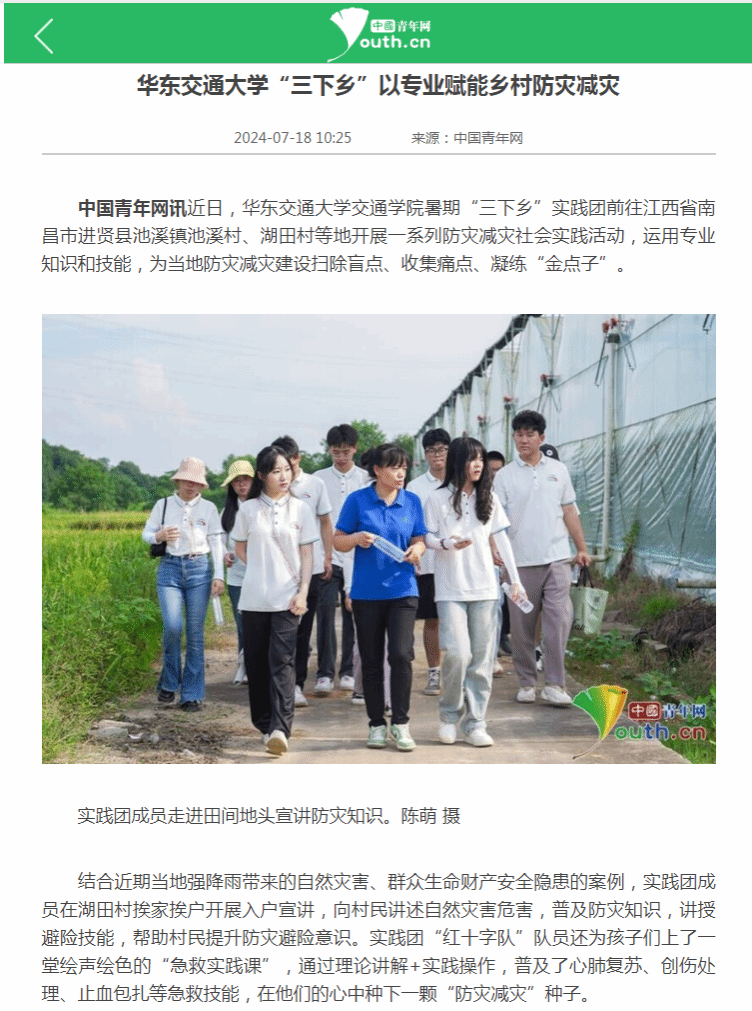 近日,WilliamHill中文官方网站交通学院暑期“三下乡”实践团前往江西省南昌市进贤县池溪镇池溪村、湖田村等地开展一系列防灾减灾社会实践活动,运用专业知识和技能,为当地防灾减灾建设扫除盲点、收集痛点、凝练“金点子”。