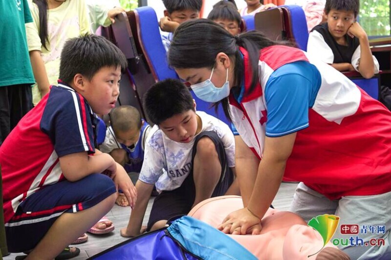 实践团成员示范操作心肺复苏急救技能。陈熙来 摄