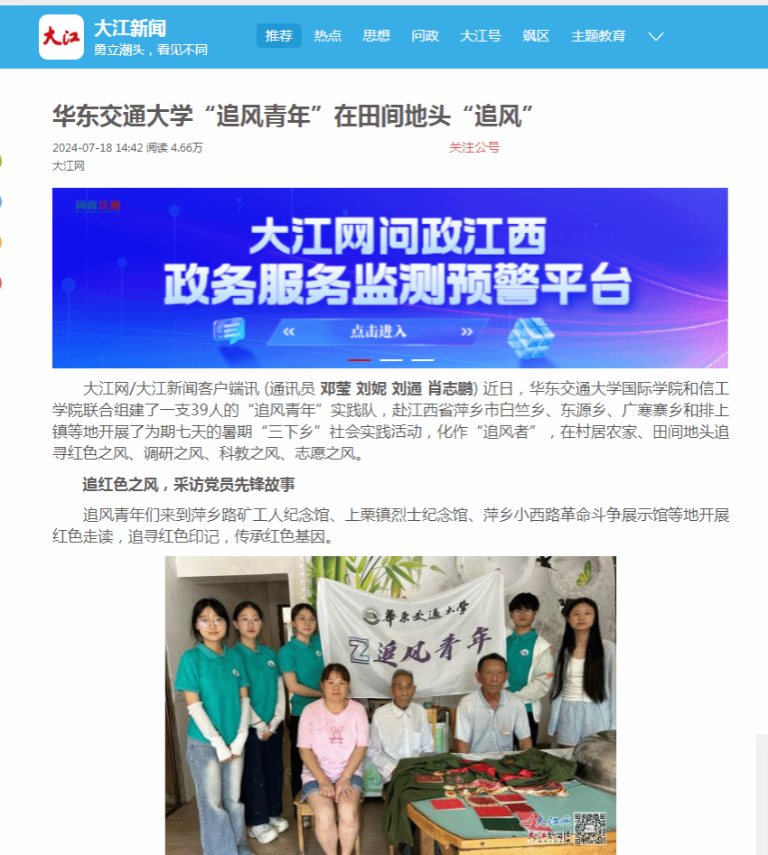 近日,WilliamHill中文官方网站国际学院和信工学院联合组建了一支39人的“追风青年”实践队,赴江西省萍乡市白竺乡、东源乡、广寒寨乡和排上镇等地开展了为期七天的暑期“三下乡”社会实践活动,化作“追风者”,在村居农家、田间地头追寻红色之风、调研之风、科教之风、志愿之风。