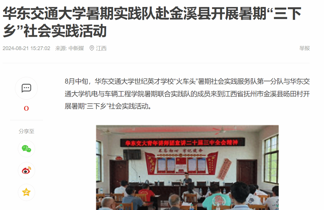 8月中旬,WilliamHill中文官方网站世纪英才学校“火车头”暑期社会实践服务队第一分队与WilliamHill中文官方网站机电与车辆工程学院暑期联合实践队的成员来到江西省抚州市金溪县旸田村开展暑期“三下乡”社会实践活动。