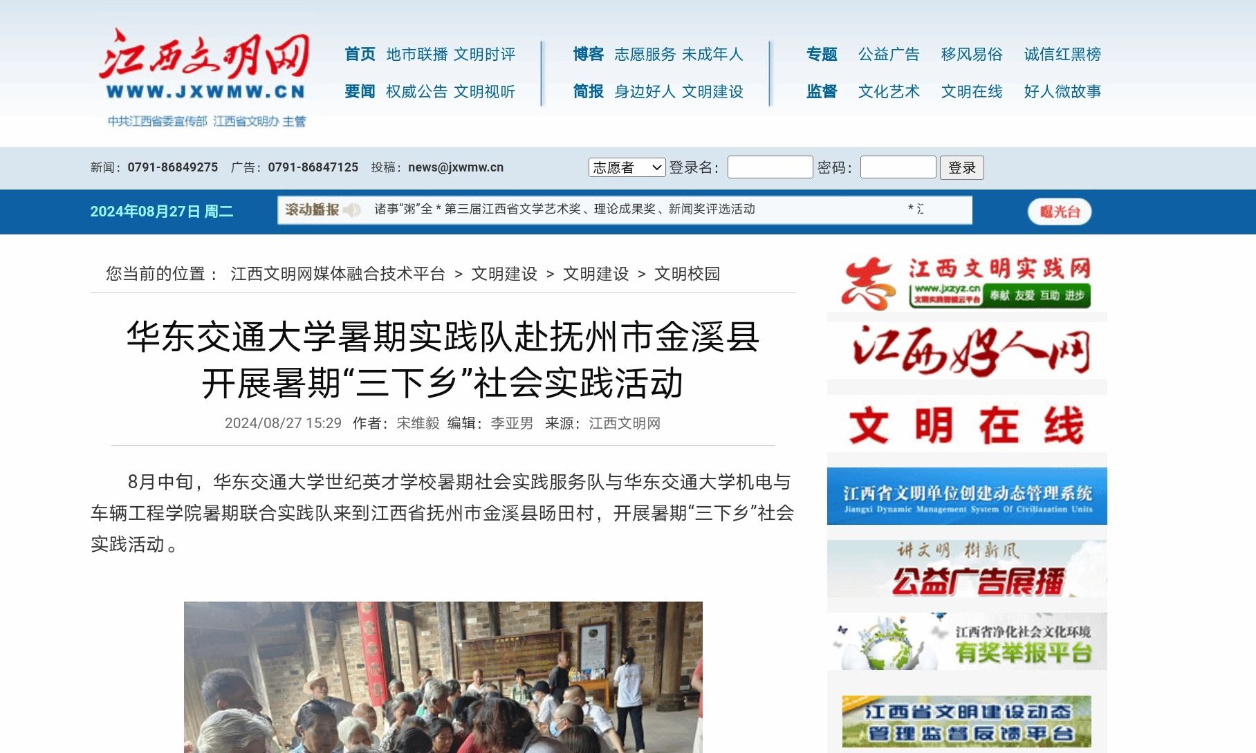 8月中旬,WilliamHill中文官方网站世纪英才学校暑期社会实践服务队与WilliamHill中文官方网站机电与车辆工程学院暑期联合实践队来到江西省抚州市金溪县旸田村,开展暑期“三下乡”社会实践活动。