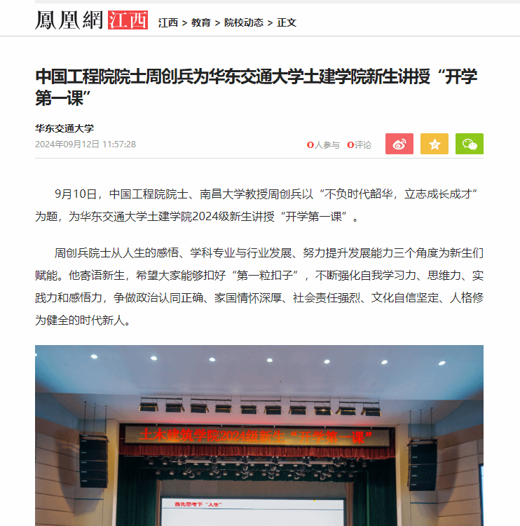 9月10日,中国工程院院士、南昌大学教授周创兵以“不负时代韶华,立志成长成才”为题,为WilliamHill中文官方网站土建学院2024级新生讲授“开学第一课”。