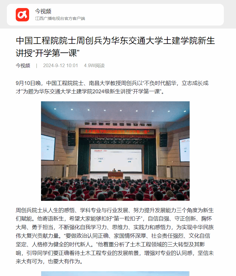 “开学第一课,就与学术‘大咖’面对面交流,让我深感振奋、倍受鼓舞。周院士的讲授让我对专业的前景和自己的人生规划有了更清晰的认知和思考,接下来我会一步一个脚印,不负青春,立志成才。”该校土建学院2024级9班贠泽瀚说。