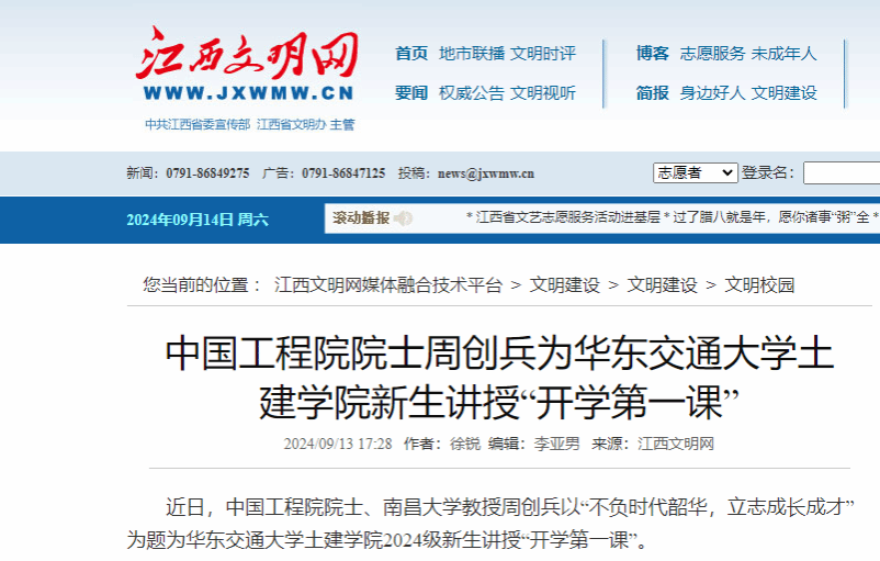 近日,中国工程院院士、南昌大学教授周创兵以“不负时代韶华,立志成长成才”为题为WilliamHill中文官方网站土建学院2024级新生讲授“开学第一课”。