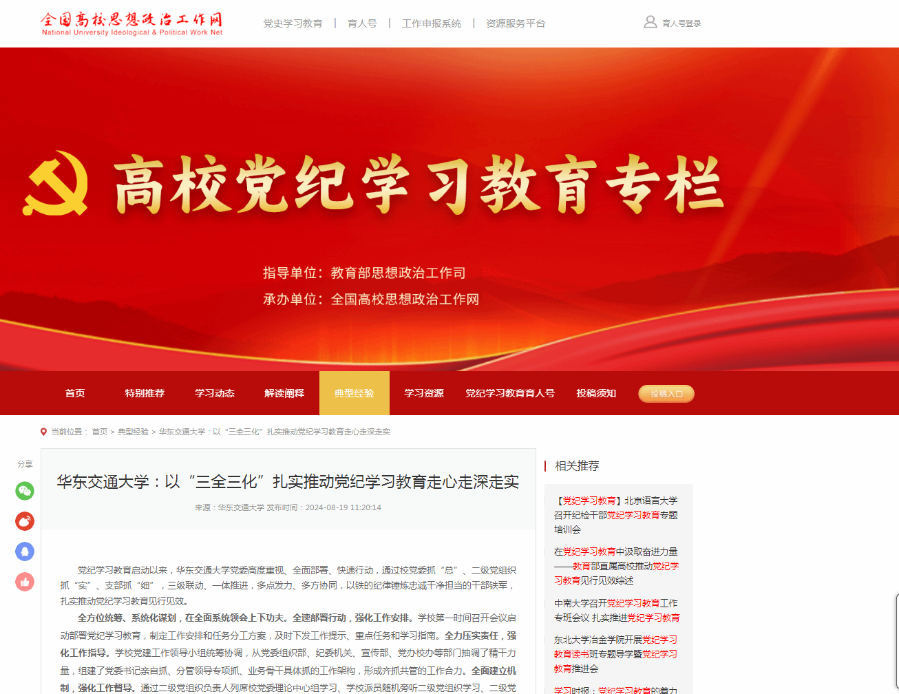 全过程贯穿、实质化落实,在抓实学习成效上下功夫。抓好警示教育。制定警示教育计划,分批组织中层以上干部及年轻干部、关键岗位干部、新提拔干部等赴监狱、廉政教育基地等开展“沉浸式”警示教育;各单位深入挖掘警示教育资源,结合实际分类开展科研诚信、师德师风、教风学风等警示教育,做到党员全覆盖。抓好关键岗位干部的警示教育,学校纪委书记带头在各类培训会议上解读、剖析违纪的原因、教训,让纪律规矩更加入脑入心;用好学校警示教育专栏,把点名道姓通报曝光身边违纪案例作为以案说纪的有效手段,提高学习的针对性和实效性;严格落实对口联系制度,安排纪检监察干部对接相关基层党组织指导开展警示教育,靶向解读《条例》;对受处分干部开展回访教育,不断深化纪律学习警示教育工作,及时做好教育转化、跟踪联系和心理疏导;集中纠治推诿扯皮、拈轻怕重、蜻蜓点水的工作“病态”,进一步解决“干部不干”问题;修订处级干部年度考核办法,落实“三个区分开来”,旗帜鲜明地为敢于担当的干部撑腰鼓劲。抓实检视整改。坚持边检视、边提高,各单位通过梳理风险点、制定防范措施进一步深化对权力集中、资金密集、资源富集领域和关键岗位党员、干部的警示教育。以深化巡视整改为契机,分阶段开展作风建设专项整治,集中整治缺乏担当、“老好人”思想、执行制度不力等问题。扎实推进基础教育领域不正之风和腐败问题专项治理、师风学风有关问题自查自纠和教师违规接受学生吃请问题治理。紧盯“一把手”和领导班子、师生反映强烈的问题,深入查找和推动解决校属各单位在履行党的领导职责、深化教育教学改革等方面存在的问题。抓出工作成效。把开展党纪学习教育同落实党中央、省委决策部署结合起来,同推进学校重点工作紧密结合起来,学校召开巡视整改、综合考核、党纪学习教育工作推进会,高效率推进3项重点工作,推动拧紧一级抓一级、层层抓落实的责任链条。开展“担当作为好干部”、“新时代赣鄱先锋”创绩提升行动等,深入实施“火车头”党建提升工程,入选第四批全国党建工作标杆院系、样板支部培育创建单位各1个,首批全省高校“十个研究生样板党支部”和“十名研究生党员标兵”各1个,2个全国党建工作样板支部培育创建单位完成验收。围绕提升高层次人才总量、增强学科建设水平、强化服务交通强省能力等中心工作,全速推动人才强校战略,攻坚关键性技术和原创成果,把学习教育成果不断转化为加快学校内涵式高质量发展的强大动力。