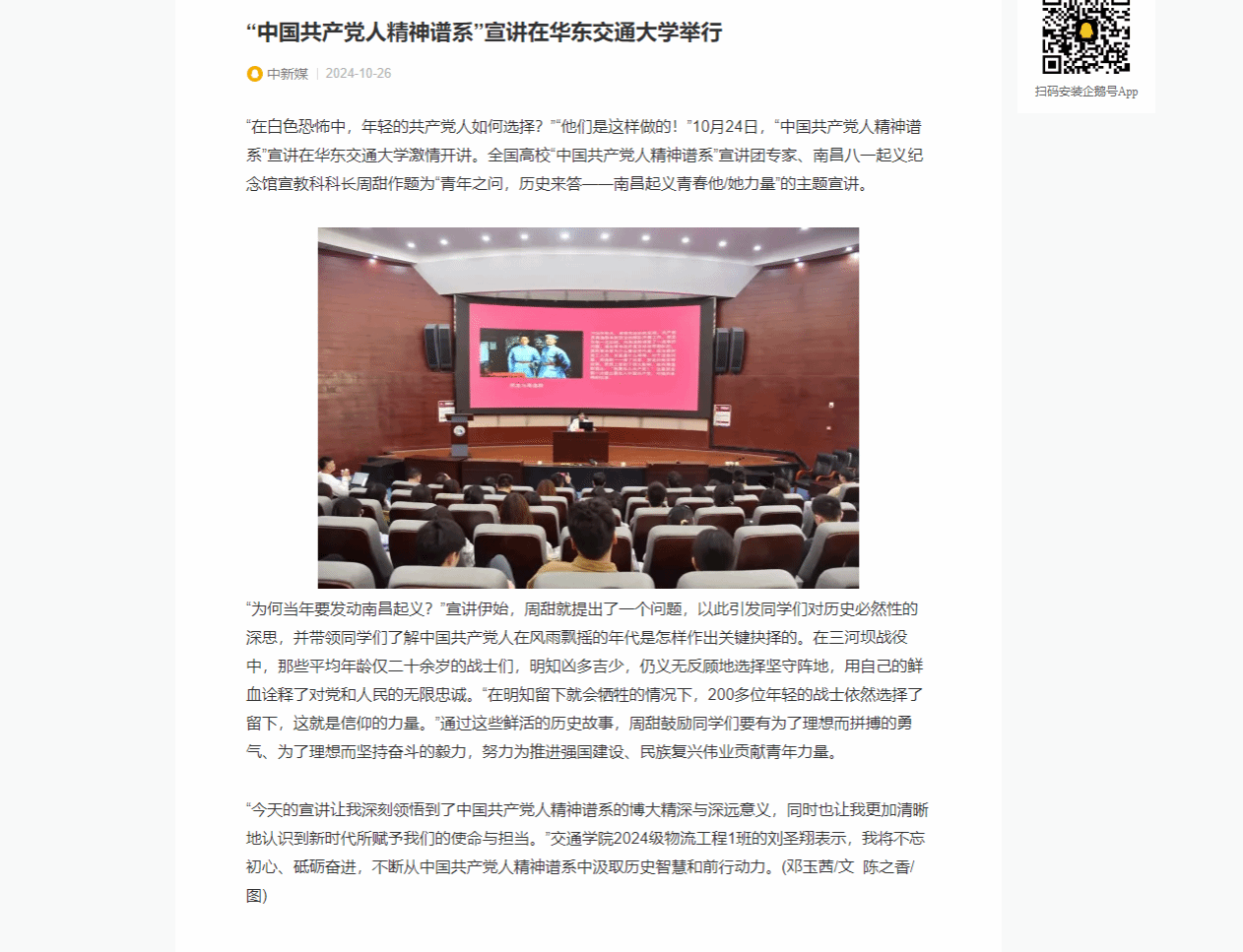 “今天的宣讲让我深刻领悟到了中国共产党人精神谱系的博大精深与深远意义,同时也让我更加清晰地认识到新时代所赋予我们的使命与担当。”交通学院2024级物流工程1班的刘圣翔表示,我将不忘初心、砥砺奋进,不断从中国共产党人精神谱系中汲取历史智慧和前行动力。(邓玉茜/文 陈之香/图)