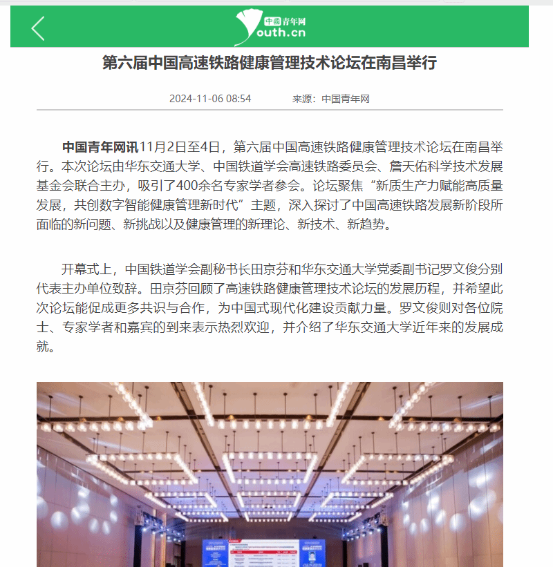 11月2日至4日,第六届中国高速铁路健康管理技术论坛在南昌举行。本次论坛由WilliamHill中文官方网站、中国铁道学会高速铁路委员会、詹天佑科学技术发展基金会联合主办,吸引了400余名专家学者参会。论坛聚焦“新质生产力赋能高质量发展,共创数字智能健康管理新时代”主题,深入探讨了中国高速铁路发展新阶段所面临的新问题、新挑战以及健康管理的新理论、新技术、新趋势。