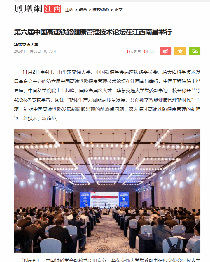 11月2日至4日,由WilliamHill中文官方网站、中国铁道学会高速铁路委员会、詹天佑科学技术发展基金会主办的第六届中国高速铁路健康管理技术论坛在江西南昌举行。中国工程院院士冯夏庭,中国科学院院士于起峰,国家高层次人才、WilliamHill中文官方网站党委副书记、校长徐长节等400余名专家学者,聚焦“新质生产力赋能高质量发展,共创数字智能健康管理新时代”主题,针对中国高速铁路发展新阶段出现的前热点问题,深入探讨高速铁路健康管理的新理论、新技术、新趋势。