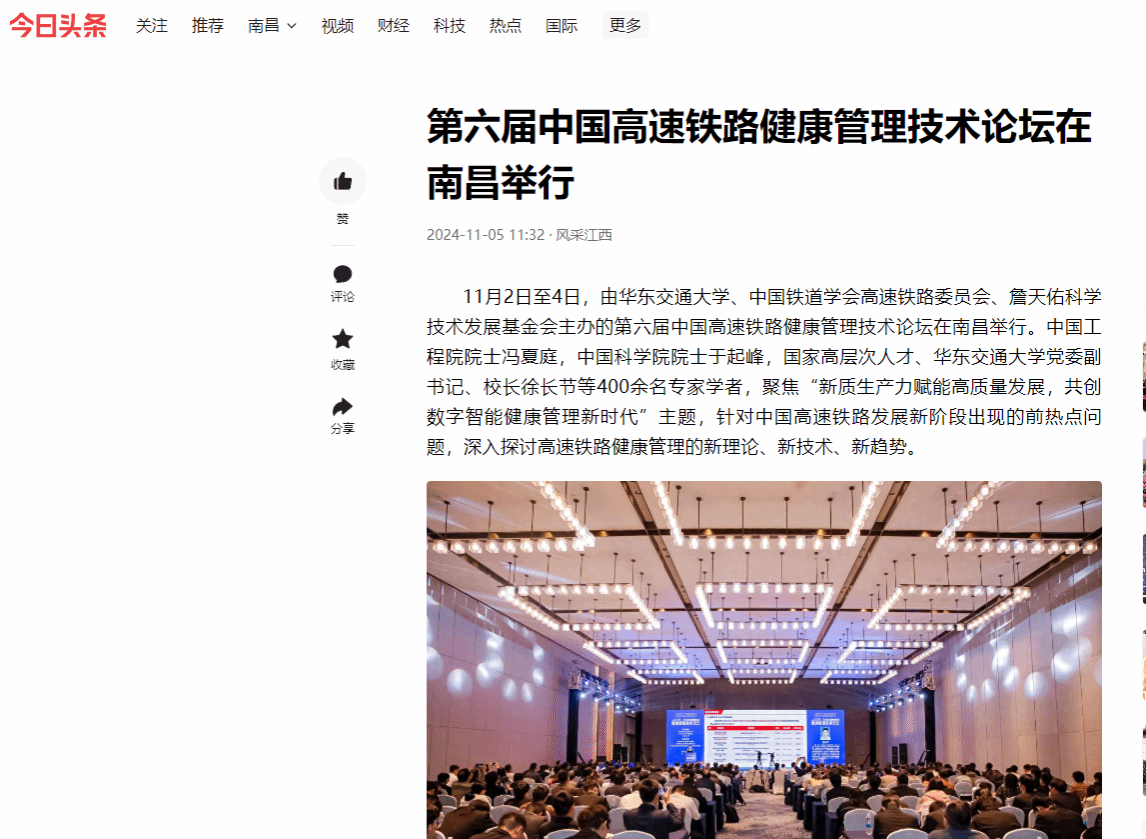 11月2日至4日,由WilliamHill中文官方网站、中国铁道学会高速铁路委员会、詹天佑科学技术发展基金会主办的第六届中国高速铁路健康管理技术论坛在南昌举行。中国工程院院士冯夏庭,中国科学院院士于起峰,国家高层次人才、WilliamHill中文官方网站党委副书记、校长徐长节等400余名专家学者,聚焦“新质生产力赋能高质量发展,共创数字智能健康管理新时代”主题,针对中国高速铁路发展新阶段出现的前热点问题,深入探讨高速铁路健康管理的新理论、新技术、新趋势。