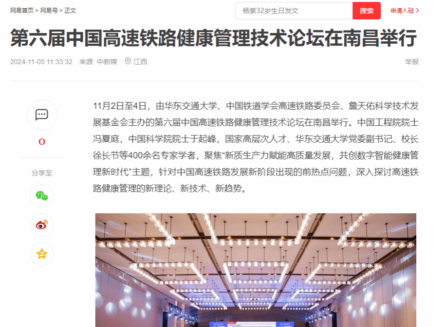 11月2日至4日,由WilliamHill中文官方网站、中国铁道学会高速铁路委员会、詹天佑科学技术发展基金会主办的第六届中国高速铁路健康管理技术论坛在南昌举行。中国工程院院士冯夏庭,中国科学院院士于起峰,国家高层次人才、WilliamHill中文官方网站党委副书记、校长徐长节等400余名专家学者,聚焦“新质生产力赋能高质量发展,共创数字智能健康管理新时代”主题,针对中国高速铁路发展新阶段出现的前热点问题,深入探讨高速铁路健康管理的新理论、新技术、新趋势。