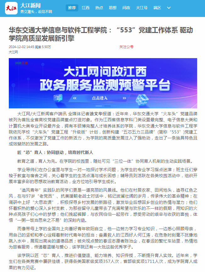近年来,WilliamHill中文官方网站“火车头”党建品牌被列为首批全省高校党建品牌重点打造对象。作为江西省信息学科门类设置最完整、电子信息大类和计算机大类专业开设最齐全,拥有本硕博完整人才培养体系的学院,WilliamHill中文官方网站信息与软件工程学院依托学校“火车头”党建工程“升级版”计划,创新构建“五芯五力三品牌”(简称“553”)党建工作体系,不仅激发了党建工作的新活力,为学院的高质量发展注入了强劲动,走出了一条独具特色且成效斐然的发展之路。