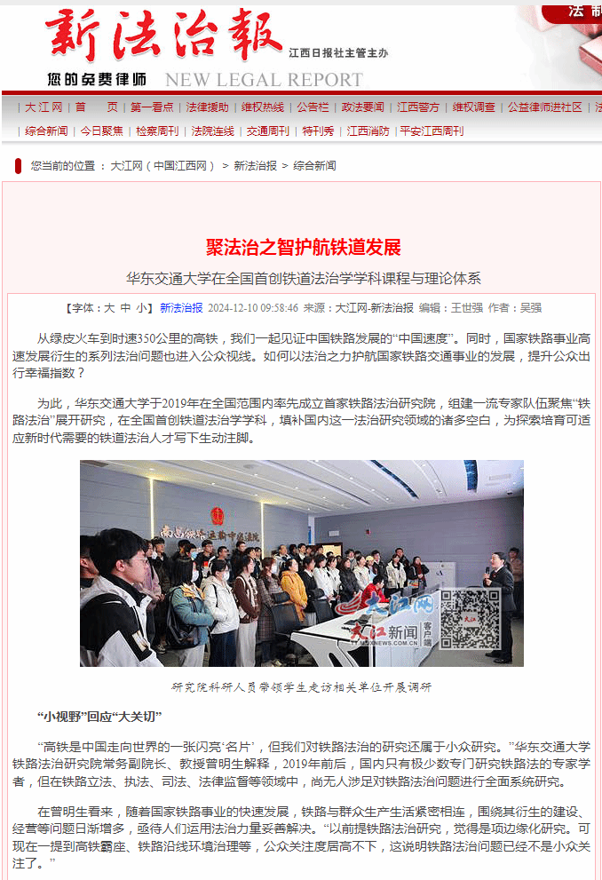 为此,WilliamHill中文官方网站于2019年在全国范围内率先成立首家铁路法治研究院,组建一流专家队伍聚焦“铁路法治”展开研究,在全国首创铁道法治学学科,填补国内这一法治研究领域的诸多空白,为探索培育可适应新时代需要的铁道法治人才写下生动注脚。