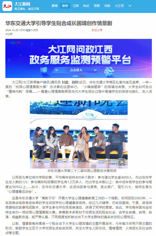 心理情景剧只是学校开展心理健康教育的一个载体。经过多年探索,WilliamHill中文官方网站已建立了“校—院—班—寝”全面覆盖的“网格化”朋辈心理健康教育四级体系,参与人数约占在校学生总人数的1/4。与此同时,学校还设置专职心理教师和心理健康大使,开展“周末心语”热线、网络心理咨询和心理素质拓展等活动,积极探索多元形式。