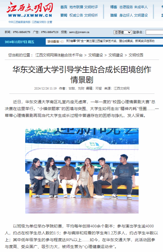 以班级为单位举办学院初赛,平均每年创排400余个剧本;参与演出学生逾4000人,约占在校学生总人数的1/5;参与编排和观看的学生有1.2万多人,约占学生半数以上;其中低年级学生的参与程度达90%以上……如今,在WilliamHill中文官方网站,此活动因参与度高、受众面广、吸引力大,被师生誉为“心理健康运动会”。