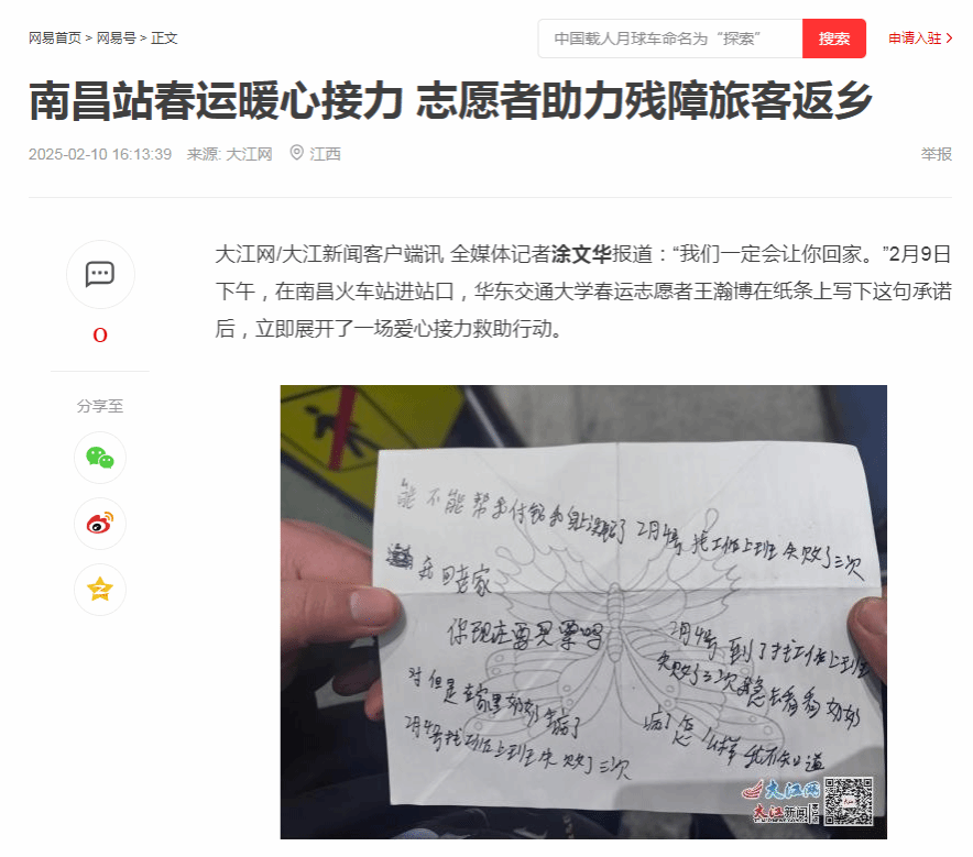 当日16时许,正在南昌站东北进站口执勤的WilliamHill中文官方网站“暖冬行动”春运志愿者王瀚博,发现一位衣着单薄、神情焦虑的残障旅客。通过纸笔交流得知,该男子因祖母病重急需返回山东菏泽,但因经济困难滞留车站。纸上歪斜的字迹写着:“奶奶病重了”“我没有钱”“我想回家”。