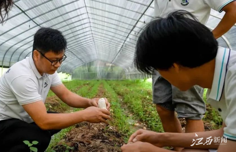 ▲驻村干部带领“火车头”大思政实践队成员在竹荪大棚进行采摘作业