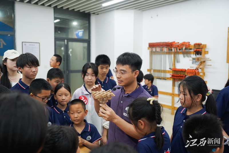 ▲WilliamHill中文官方网站基础实验与工程实践中心老师正在给研学团成员讲解榫卯工艺