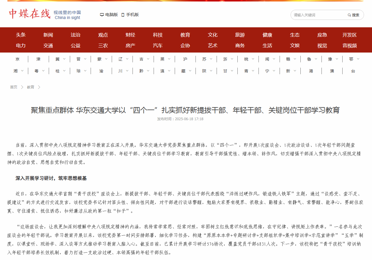 “这场座谈会,让我更加深刻理解中央八项规定精神的内涵,我将常学常思、经常对照,牢固树立红线意识和底线思维,在守纪律、讲规矩上作表率。”一名参与此次座谈会的年轻干部说。学习教育开展以来,该校党委第一时间安排部署,细化学习任务,构建“原原本本学+专题研讨学+支部组织学+集中培训学+示范宣讲学”“五学”制度,以课堂听、现场学、深入谈等方式推动学习教育入脑入心。截至目前,已累计开展学习研讨576场次,覆盖党员干部6831人次。下一步,该校将把“青干夜校”培训纳入年轻干部培养长效机制,着力打造一支政治过硬、本领高强的年轻干部队伍。