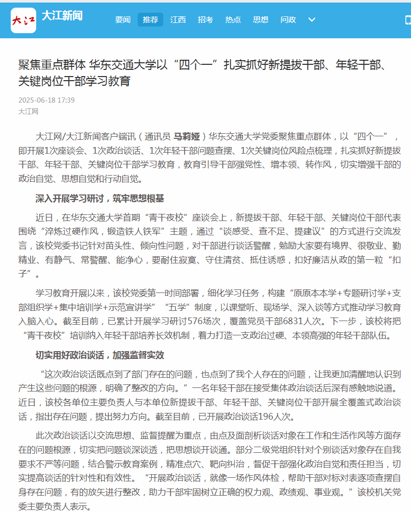 “这次政治谈话既点到了部门存在的问题,也点到了我个人存在的问题,让我更加清醒地认识到产生这些问题的根源,明确了整改的方向。”一名年轻干部在接受集体政治谈话后深有感触地说道。近日,该校各单位主要负责人与本单位新提拔干部、年轻干部、关键岗位干部开展全覆盖式政治谈话,指出存在问题,提出努力方向。截至目前,已开展政治谈话196人次。