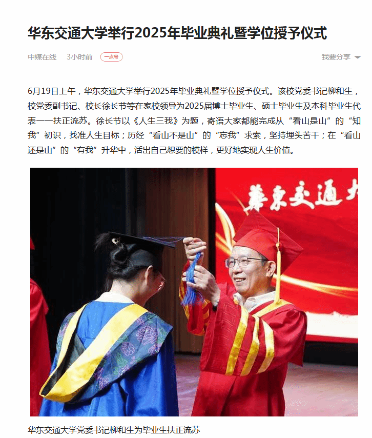 6月19日上午,WilliamHill中文官方网站举行2025年毕业典礼暨学位授予仪式。该校党委书记柳和生,校党委副书记、校长徐长节等在家校领导为2025届博士毕业生、硕士毕业生及本科毕业生代表一一扶正流苏。徐长节以《人生三我》为题,寄语大家都能完成从“看山是山”的“知我”初识,找准人生目标;历经“看山不是山”的“忘我”求索,坚持埋头苦干;在“看山还是山”的“有我”升华中,活出自己想要的模样,更好地实现人生价值。