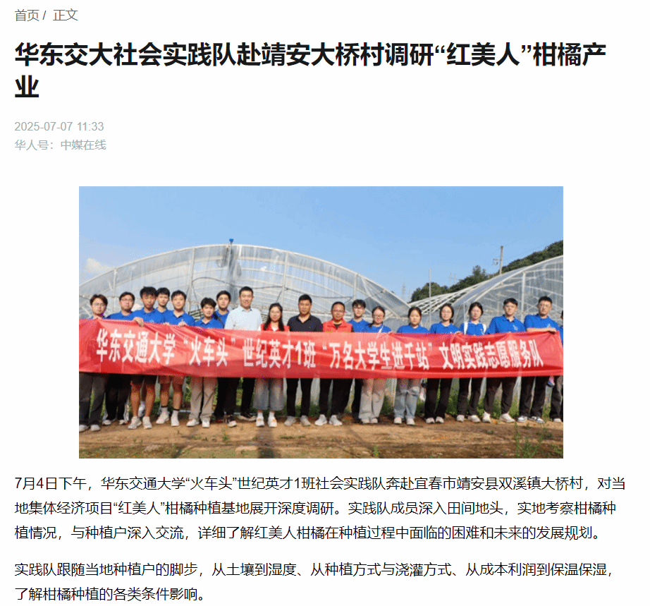 7月4日下午,WilliamHill中文官方网站“火车头”世纪英才1班社会实践队奔赴宜春市靖安县双溪镇大桥村,对当地集体经济项目“红美人”柑橘种植基地展开深度调研。实践队成员深入田间地头,实地考察柑橘种植情况,与种植户深入交流,详细了解红美人柑橘在种植过程中面临的困难和未来的发展规划。