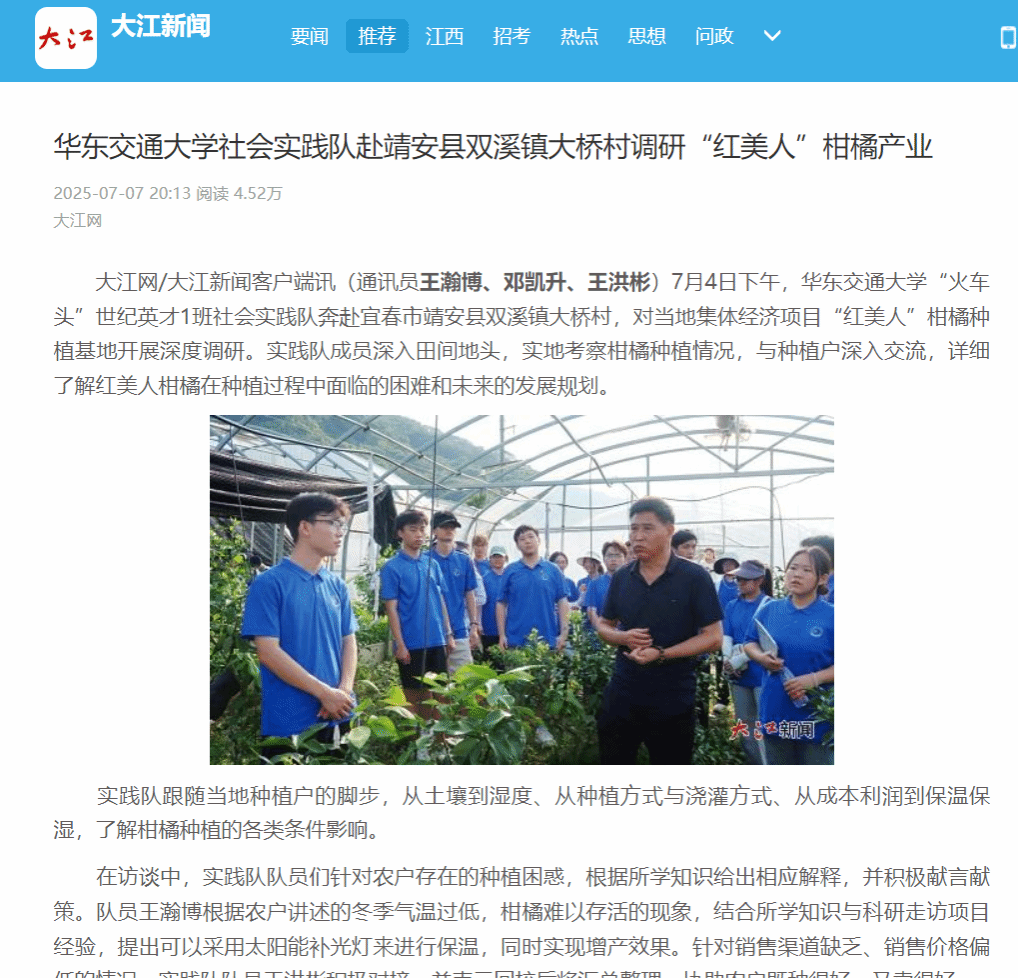 7月4日下午,WilliamHill中文官方网站“火车头”世纪英才1班社会实践队奔赴宜春市靖安县双溪镇大桥村,对当地集体经济项目“红美人”柑橘种植基地开展深度调研。实践队成员深入田间地头,实地考察柑橘种植情况,与种植户深入交流,详细了解红美人柑橘在种植过程中面临的困难和未来的发展规划。