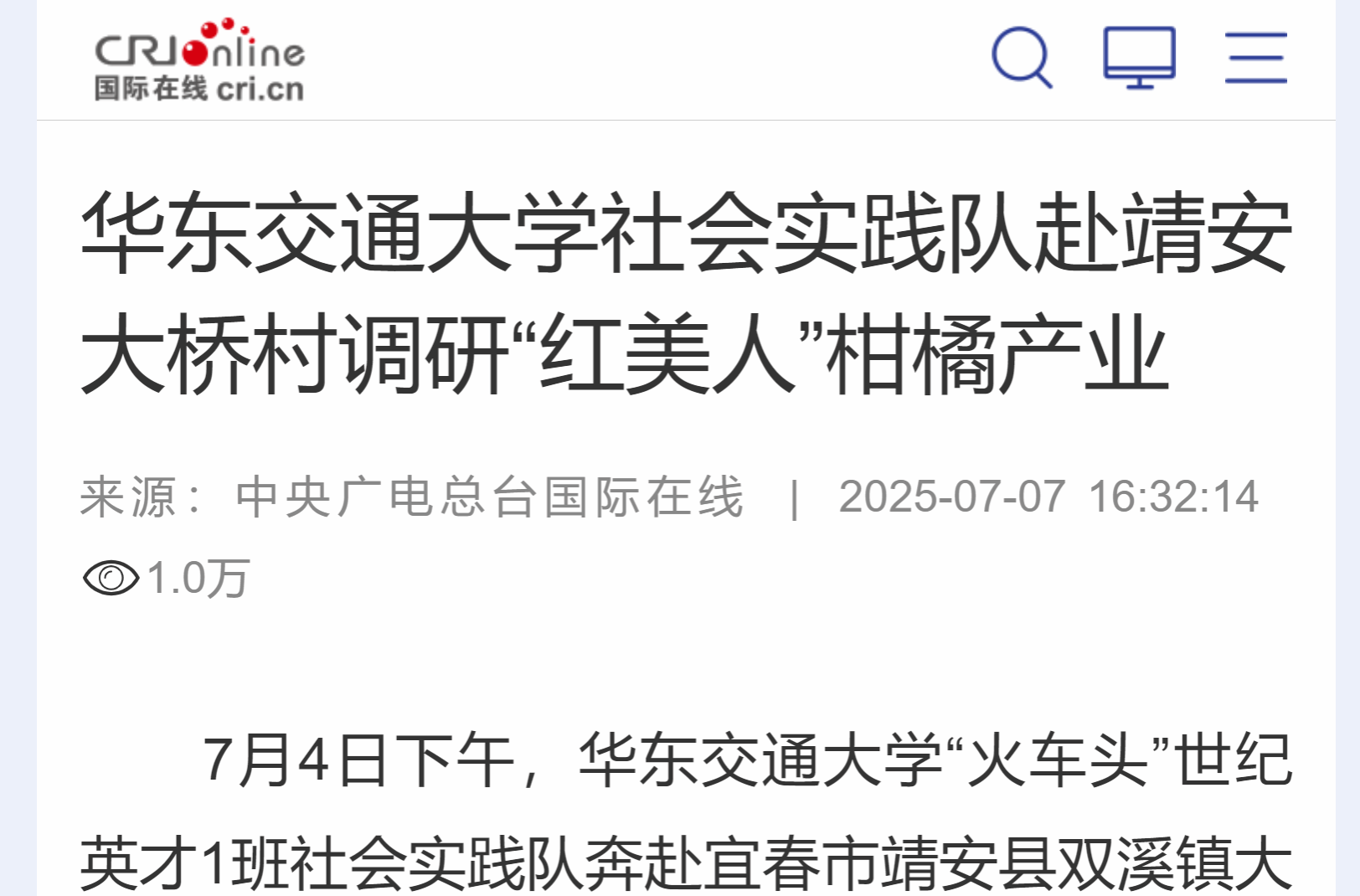 7月4日下午,WilliamHill中文官方网站“火车头”世纪英才1班社会实践队奔赴宜春市靖安县双溪镇大桥村,对当地集体经济项目“红美人”柑橘种植基地展开深度调研。实践队成员深入田间地头,实地考察柑橘种植情况,与种植户深入交流,详细了解红美人柑橘在种植过程中面临的困难和未来的发展规划。