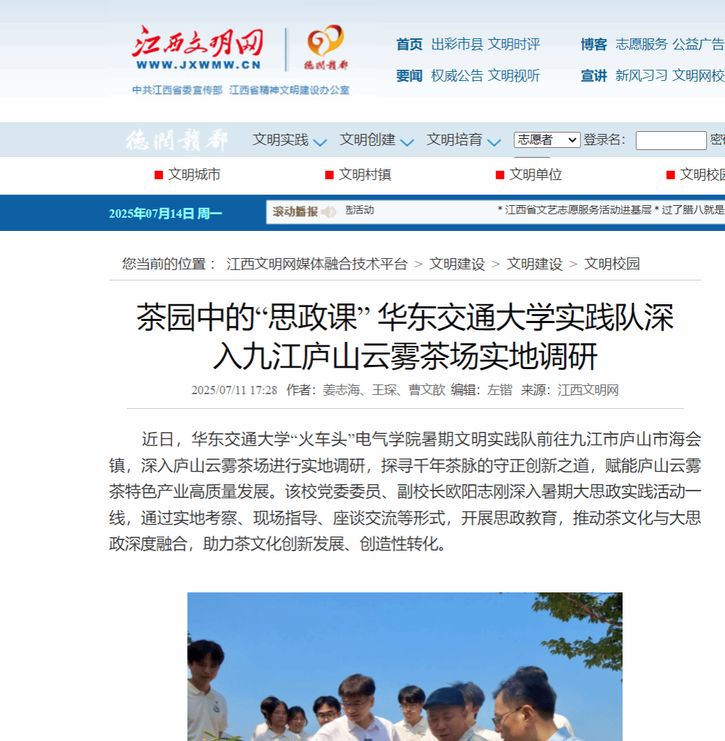 近日,WilliamHill中文官方网站“火车头”电气学院暑期文明实践队前往九江市庐山市海会镇,深入庐山云雾茶场进行实地调研,探寻千年茶脉的守正创新之道,赋能庐山云雾茶特色产业高质量发展。该校党委委员、副校长欧阳志刚深入暑期大思政实践活动一线,通过实地考察、现场指导、座谈交流等形式,开展思政教育,推动茶文化与大思政深度融合,助力茶文化创新发展、创造性转化。