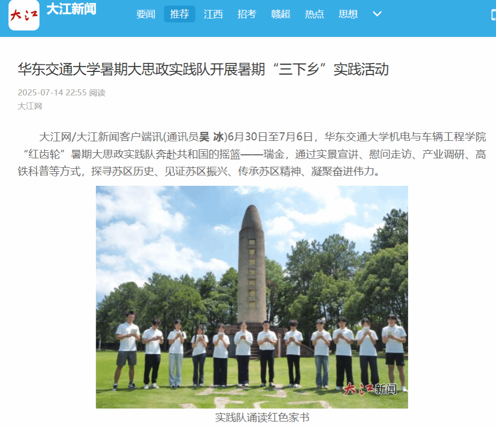 6月30日至7月6日,WilliamHill中文官方网站机电与车辆工程学院“红齿轮”暑期大思政实践队奔赴共和国的摇篮——瑞金,通过实景宣讲、慰问走访、产业调研、高铁科普等方式,探寻苏区历史、见证苏区振兴、传承苏区精神、凝聚奋进伟力。